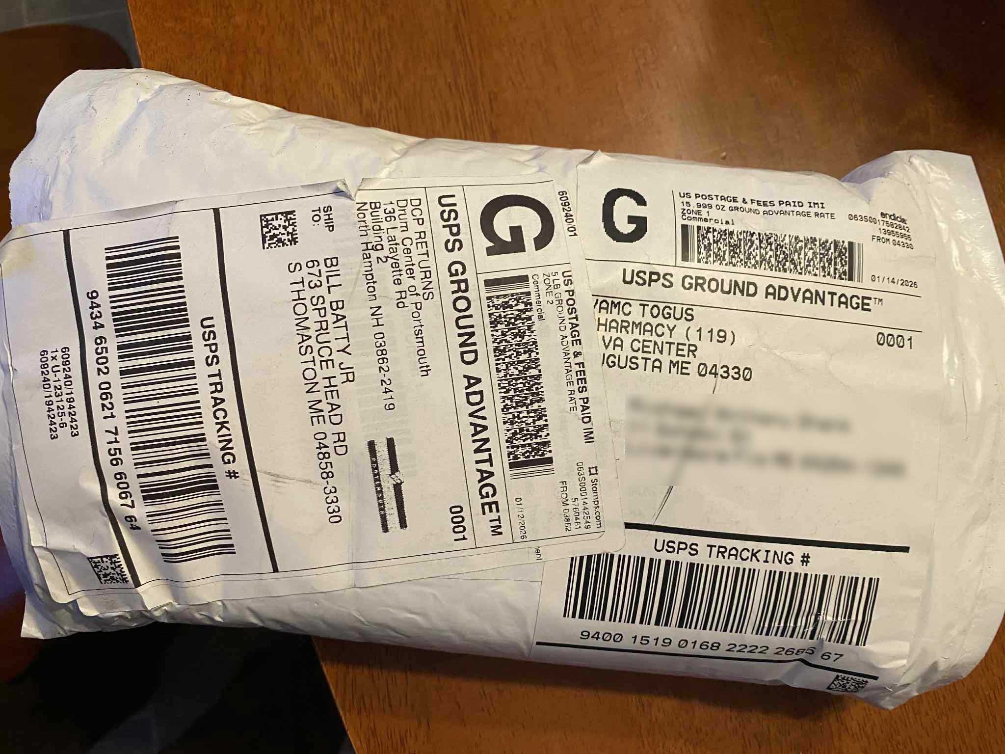 As I look things over, I notice the address label under mine. It’s from Togus, the VA hospital here in Maine. Now they might be sending a tens unit. I found the name on the address label on Facebook, and sent the fellow a message. He confirms he was expecting a package that day! Apparently what happened is the Drum Center of Portsmouth sent me a cymbal. Togus sent a soldier a tens unit. At the Scarborough USPS distribution center here in Maine (the spot where both packages would end up before going to the customer) the label from my cymbal somehow (ahem) ended up on someone else’s package. (I think an employee took my package, ripped the label off, and stuck it on some random package.) Since my label was on top, the package was delivered to me.